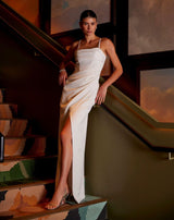 The Draped Maxi Dress is part of our Fall 2023 Runway Collection. This tailor gown features a corset-style bodice and soft draping. The asymmetrical draping at waist and dramatic side slit add unique flare. Concealed back zipper.