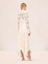 The Camila Dress is a long sleeve midi silhouette crafted in floral lace, featuring a plunging neckline