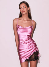 Ruched, for your pleasure. Ultra chic Silk Ruched Dress, cut from luxe silk charmeuse with cowl neckline and adjustable straps. Features adjustable side ruching and asymmetrical hem, with lace detail for added sex appeal. Layer over your favorite Essential panty and be the best dressed guest at any party.
