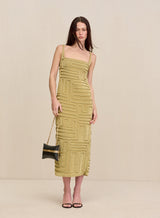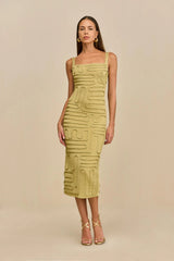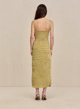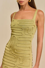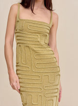 An artful square neck midi dress made of golden knit yarn featuring an eye-catching abstract corded overlay.