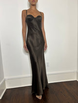The Sayla silk gown melds vintage glamour and modern sophistication. Constructed with molded cups secured by a traditional hook and eye closure, this event-ready style offers a secure, supportive fit. Now in timeless champagne.