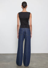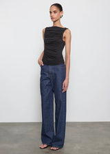 Sleeveless top with high boat neckline and ruching throughout the body.
