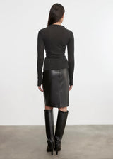 Pencil skirt in luxe stretch vegan leather. Slim fit with a clean waistband, knee length, and a concealed back zipper closure.