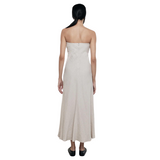 The Linen Bias Dress is crafted from 100% linen for comfort and breathability. Featuring a straight neckline, maxi length, and back zipper with hook closure.