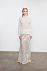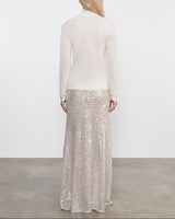 Full-length sequin skirt featuring an all-over embellished design with an elastic waistband. Cut on bias. Made in USA