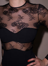Our Bouquet Lace & Jersey Bodysuit, featuring stretch floral Leavers lace paneling with luxe Italian jersey body. Back zipper and bottom snap closure. High leg cut. Take it out with the Tuxedo Pant.
