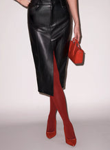 Our vegan leather Harley Skirt, featuring flattering high waist fit with garter seam details and functional pockets. Front slit for added sex appeal. Falls just below the knee. Looks chic with the Harley Bodysuit.
