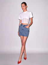 Our Sabrina Corset T-Shirt, cut from lightweight cotton with sporty mesh bottom panel. Features boning channels to sculpt and flatter your figure with side lace up detail for added edge. Invisible zipper to ensure proper fit. Pair with jeans or elevate your favorite pair or trousers.