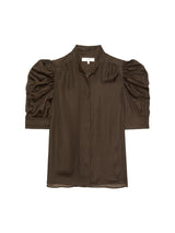 At once modern and feminine, this silk blouse has become a FRAME favorite. Featuring a high neckline and subtle puffed sleeves with ruched detailing, it easily complements any of your denim.