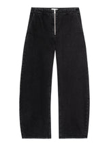 This jean features an exposed zipper, trouser pockets, and a playful curved outseam for an unexpected twist on structure.