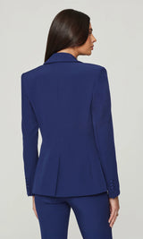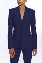 The Aimee Crepe Blazer brings tailored structure and sleek sophistication to any wardrobe. Designed in navy stretch crepe, it features a cinched waist, strong shoulder lines, and a single-breasted front. Sharp yet feminine, this polished piece layers effortlessly over blouses, dresses, or trousers for desk-to-dinner dressing.