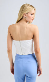 This contemporary piece redefines modern sophistication with its white floral lace, bustier-inspired silhouette, and tailored vest detailing. Perfect for elevating your spring wardrobe, this vestier combines structure and style in a fashion-forward design.