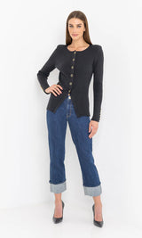 The Cherish Cardigan is all about sleek simplicity. This collarless, ribbed knit design features a flattering cutaway hem and glossy gold-rimmed buttons that elevate its clean silhouette. The slim fit hugs the body just right, making it perfect for layering or wearing solo. Polished and effortless, this black cardigan is a timeless essential with a modern edge.