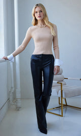 Gold trim at the neckline and crisp poplin cuffs introduce contemporary flair to this classic rib sweater. A polished choice for fall, it pairs effortlessly with everything from casual denim to sleek vegan leather.