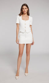 Take your office wardrobe back to the 80's with the Regina. With short sleeves, padded shoulders and a vest-inspired hem, this lined, smooth crepe blazer has a touch of retro chicness. Style with pleated trousers and mary janes for a professional vintage-inspired look.