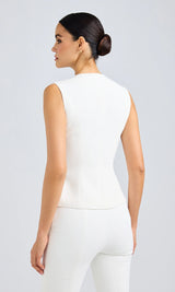 This chic white stretch crepe crew neck vest, featuring stylish faux pearl rim buttons, offers a modern alternative to the traditional tops in your spring wardrobe. Pair it effortlessly with pants or skirts for a polished ensemble.