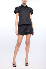 The Murphy Pearl Embellished Poplin Shirt reimagines a timeless classic with a touch of glamour. Crafted from crisp black stretch poplin, this short-sleeve button-down is adorned with delicate pearls throughout for a refined yet playful finish. Perfectly tailored and endlessly versatile, it pairs effortlessly with denim, skirts, or suiting separates.