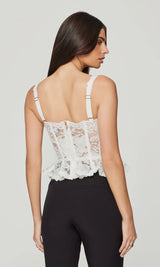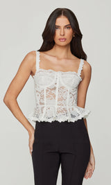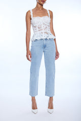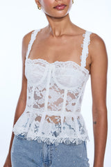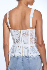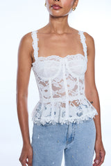 The Nicole Mesh Lace Bustier blends romantic lace with a sculpted fit, featuring feminine straps and a peplum hem for a flattering, statement silhouette.