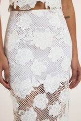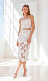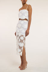 This floral mesh midi skirt features a bold side slit and a mini skirt lining, allowing for a captivating sheer effect on the legs. Style it with the matching cami for a refined summer set.
