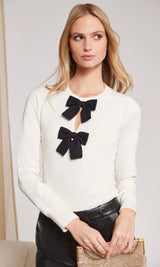 Sweet with a touch of sparkle, the Salome Crystal Bow Sweater is a feminine update to your knitwear rotation. Crafted from a soft viscose blend, this crewneck sweater is adorned with two black bows topped with crystal embellishments for a playful yet polished finish. Perfect with sequin shorts for holiday parties or dressed down with denim for an everyday chic look.