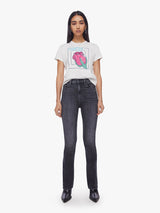 Heavy petal. A classic crewneck with short sleeves, a cropped hem and a slim fit. Made from 100% cotton, the white tee features a faded rose graphic and text on the front.