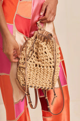 Natural woven backpack silhouette featuring coordinating neutral smooth leather straps and adjustable opening.