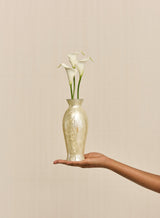 A marbled acrylic vase of calla lilies that opens for storage and functions as wearable art. Handmade with love, each Calla flower is unique.