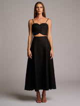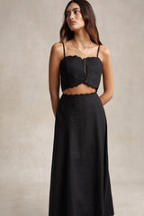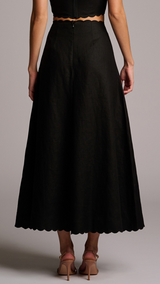 Cut from linen, the Delilah skirt is detailed with scalloped embroidery at the waist and hem. A full silhouette and scalloped edge complete the look