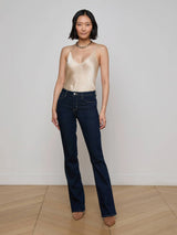 A sleek, slim bootcut jean, fitted through the hips and knee. A contoured waistband securely hugs the natural waist without gaping. The Selma is now back in a clean dark blue wash.