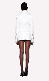 The Reed Jacket is a stylish faux leather biker jacket featuring textured fabric, silver hardware, and added shoulder pads for extra structure. It also has an adjustable belt, giving it a cool and edgy look.
