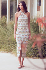 Leah is a fitted halter-neck top in a chic cream print jacquard. This stretch knit features an open back and twist neck detail with tie-back closure. Pair with jeans or complete the set with the coordinating Roura pant or Rowen skirt.