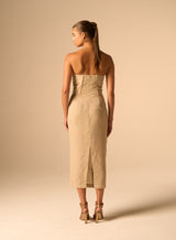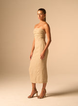 Strapless midi dress with a sleek column silhouette, straight neckline, structured bodice, and a back hem slit that allows for comfortable movement. Concealed back zipper closure for a seamless look. Composition: 100% Polyester Color: Parchment Care: Wash cold. Fit: True to size. Made in India.