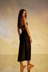 "The La Sirene Dress Alma in Black is made with 84% polyamide and 16% spandex, providing a comfortable and stretchy fit. Perfect for any occasion, this dress offers both style and comfort with its high-quality materials."