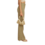 A high-waisted, slightly flared pant with fold-over cuff and trouser pleats.