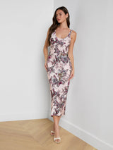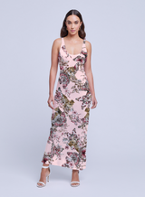 Minimal, elegant, and flattering, the Akiya dress is an evening essential. Lustrous, bias-cut satin drapes beautifully over the figure. Now back in light pink with a butterfly jungle print.