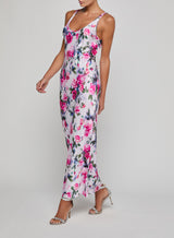 Romantic, elegant, and flattering, the Akiya dress is a day-to-night essential. Lustrous, bias-cut satin drapes beautifully over the figure. This all-time bestseller is now back in a pink rose print.
