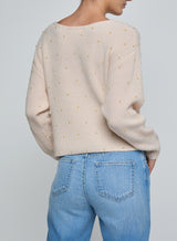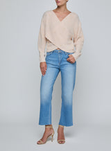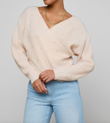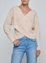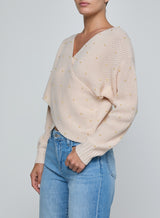 The epitome of cozy chic. Crafted in a light pink knit with simulated pearl accents, it drapes effortlessly across the body with a deep V-neckline and overlapping front panels. The Antonella sweater brings effortless elegance to every look, from off-duty to evening.