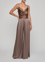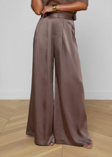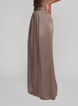 Sleek sophistication, exemplified. The Aubrie is an infinitely cool satin trouser, constructed with sharp pleats and an ultra wide cut for beautiful movement and drape. Now back in cardamon brown.