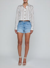 This style was featured in our Spring 2026 NYFW presentation, After Hours. Subtle distressing and a frayed hem lend a casual cool vibe to this quintessential jean short, now back in an aged light wash.