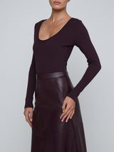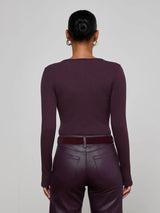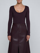 An everyday essential, the Elara bodysuit is made from a high recovery stretch rib for a smooth, body-contouring fit. Designed with long sleeves and a sultry scoop neck, it’s perfect for layering or wearing on its own. Now in dark malbec.