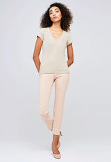 A taupe colored, classic cut tee with a sharp V-neckline and short sleeves is crafted from a super soft cotton with a light hand. The slim fit and flattering neckline make this closet-staple an ideal base layer.