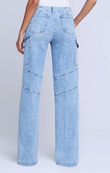 A wide-leg utility jean in light-wash premium stretch denim. The high-rise style is fitted through the hips before releasing into a beautifully proportioned wide-leg. Includes slant, back, and two side flap pockets, center seaming, and three-panel construction. Zip fly closure.
