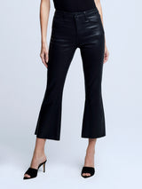 A high-rise cropped flare jean in a lustrous coated premium denim with a saturated black hue. High-recovery denim hugs from waistband to knee before extending into a flared cropped leg finished with a raw hem. Includes five-pocket construction and front zip fly closure with tonal button.