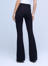 A flatteringly proportioned flare-leg jean in true-black premium stretch denim. Contoured waistband fits securely at the natural waist, smoothing and slimming the figure, while supple, lightweight stretch denim hugs hip, thigh, and knee before releasing into a cool flared hem. Classic five-pocket construction and front zip fly closure.