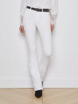 A classic high-rise jean in white premium stretch denim. Contoured waistband fits securely at the natural waist, while the design hugs from hip to knee before releasing into a slim bootcut hem. High-recovery denim holds its shape, smoothing the figure without sacrificing comfort. Classic five-pocket construction and zip fly closure.