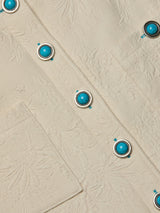 Our bestselling miniskirt is back for the season in a unique floral jacquard with texture and dimension. Bold turquoise buttons and topstitching and a pop of color.