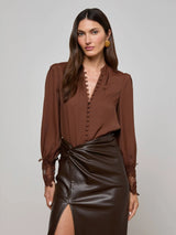 The Ava is a L’AGENCE classic year after year. This beautiful vintage-inspired blouse is crafted with extended cuffs in exquisite scalloped lace. Now in hot fudge brown.
