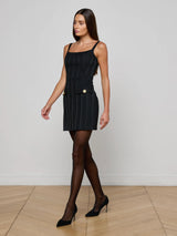 This style debuted at our Fall ‘25 NYFW presentation. The shape and structure of a corset mini dress meets the sophistication of a twill Italian suit fabric with a subtle satin stripe. A sleek and sexy take on the little back dress.