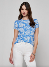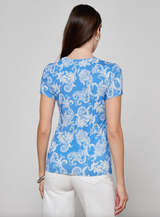 Our all-time bestselling tee. Crafted in a soft, supple fabrication with a flattering, slim cut, the Ressi returns every season in fresh shades and prints—and is worth collecting in every color. Now back in blue with an ivory paisley print.