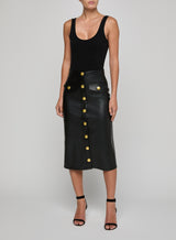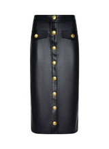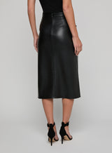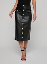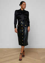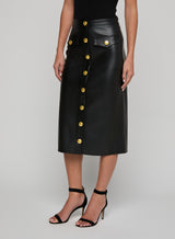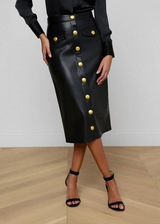 A sleek silhouette and luxe accent buttons define our Milann vegan leather skirt. The pencil skirt silhouette hugs the waist before draping straight to the midi hem. The buttons convert to functional snaps at the hem, letting you create a front-slit look. Wear it with a minimalist top and pointed-toe boot to let the skirt take center stage.